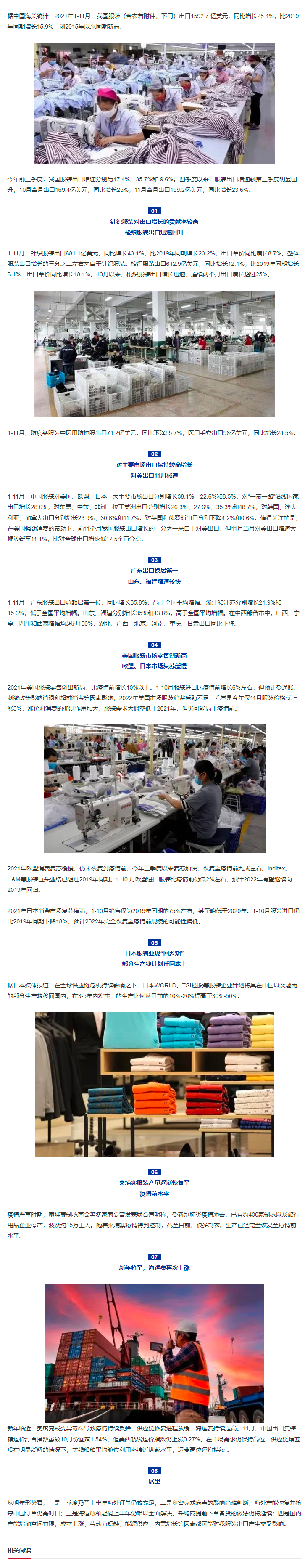 2021年1-11月我国服装出口创2015年以来同期新高