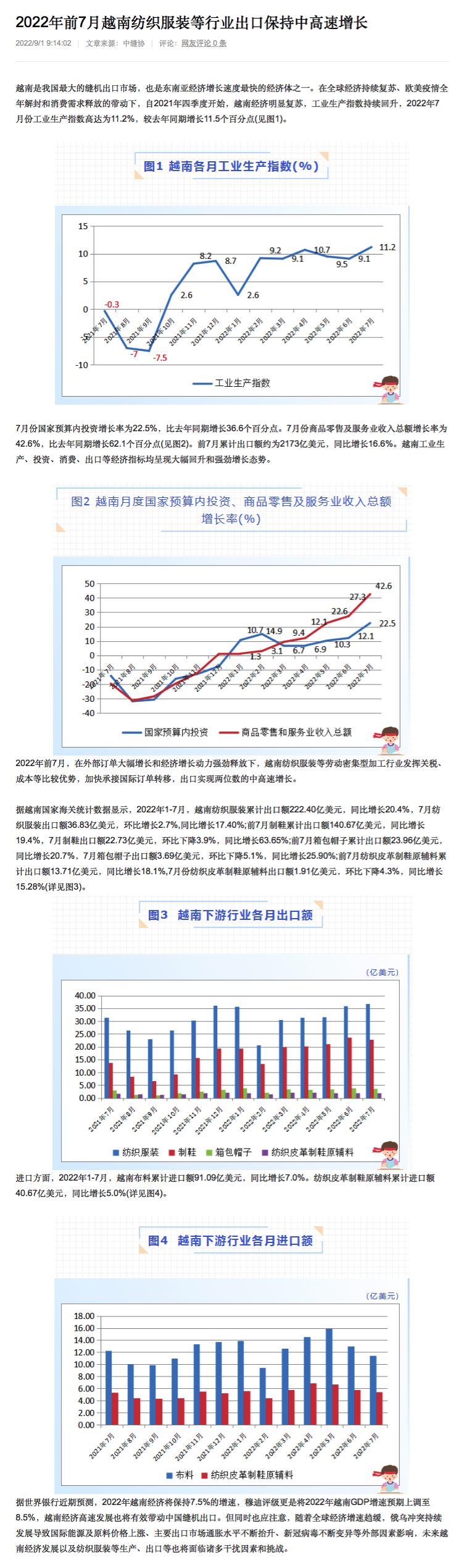 2022年前7月越南纺织服装等行业出口保持中高速增长