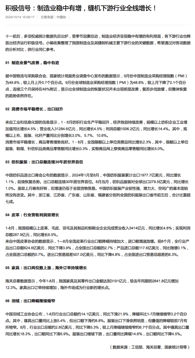 积极信号:制造业稳中有增,缝机下游行业全线增长!